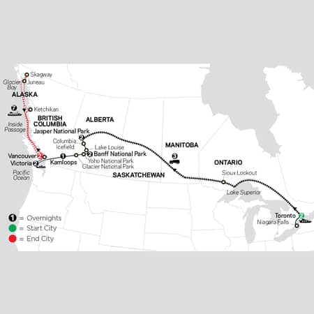 NOTE:Operation of the Niagara Falls sightseeing cruise is subject to favorable weather and/or river conditions. Favorable conditions usually exist from May to October. When conditions are unfavorable, a visit to Journey Behind the Falls will be substituted.Day 3:TORONTO-VIA RAIL THE CANADIAN This morning, transfer to Union Station for a departure on The Canadian, VIA Rail 's premier transcontinental train. Spend the next three days and nights on this classic trip across Canada 's heartland. Your Sleeper-Plus class rail cars are refurbished art-deco cars from the 1950s. Domed observation cars let you enjoy views of the Canadian countryside as you roll past Ontario 's landscapes. Chef-prepared meals offer a tempting array of soups, salads, main courses, and desserts. (L,D)