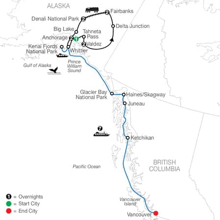 TOUR HIGHLIGHTALASKAN ADVENTURE Sailing the Inside Passage offers opportunities to spot some of Alaska 's most iconic wildlife, with humpback whales and orcas plying the bountiful waters alongside the ships, bald eagles soaring overhead, and brown (grizzly) bears lumbering on the shoreline. One of the greatest cruising routes in the world, the Inside Passage stretches through stunning landscapes, from Misty Fjords National Monument to famed Glacier Bay National Park & Preserve.Day 17:VANCOUVER, BC (DISEMBARKATION) Safe travels until we meet again! Your vacation ends with breakfast this morning. Schedule flights departing from Vancouver International Airport after noon. (B)